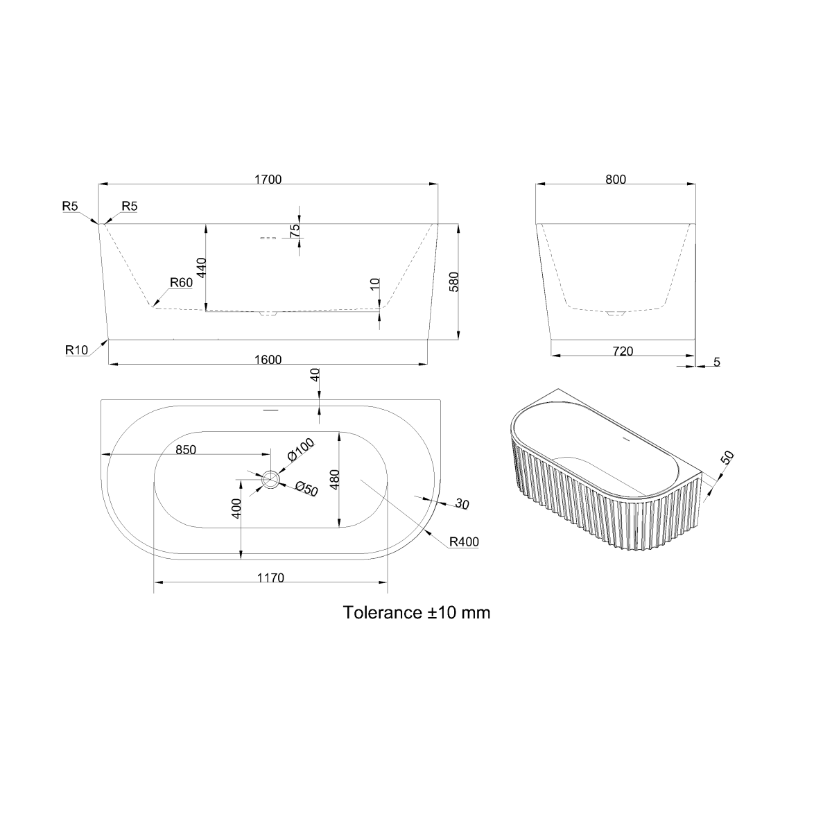 INVENA GLAMOUR wanna wolnostojąca przyścienna 170x80 cm biała ryflowana