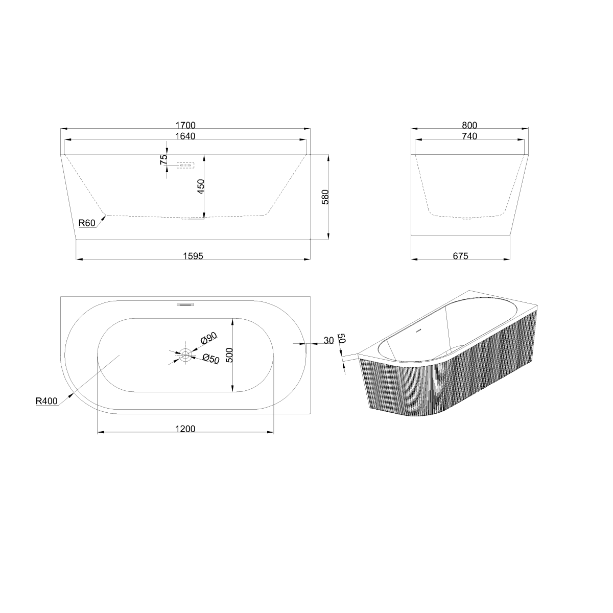 INVENA GLAMOUR wanna wolnostojąca przyścienna prawa 170x80 cm biała ryflowana