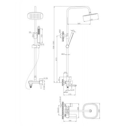 Dane techniczne: - szerokość baterii: 208 mm - długość baterii: 190 mm - drążek o wysokości: 940-1380 mm - deszczownica: 220x220 mm - wąż natryskowy: 1500 mm