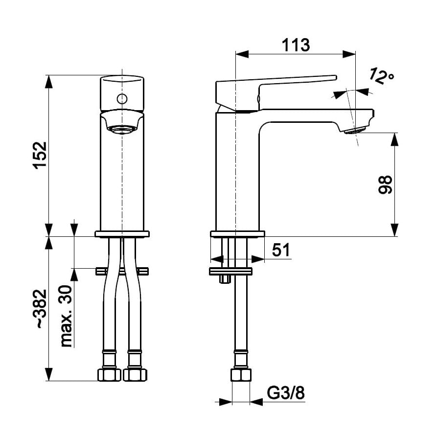 Dane techniczne: - regulator ceramiczny 30 - przepływ wody: 11,2 l/min - ciśnienie robocze: 3 atm - temperatura wody maks.: 90/65°C - długość wylewki: 113 mm - przyłącza elastyczne: L=450 mm