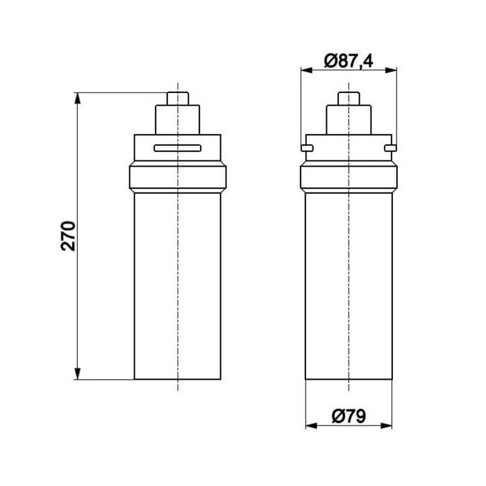 Dane techniczne: - wysokość filtra: 270 mm - średnica filtra: 79 mm - przepływ [l/min]: 3 - ciśnienie robocze [bar]: 2 - 6 - temperatura wody [°C] maks.: 30 °C
