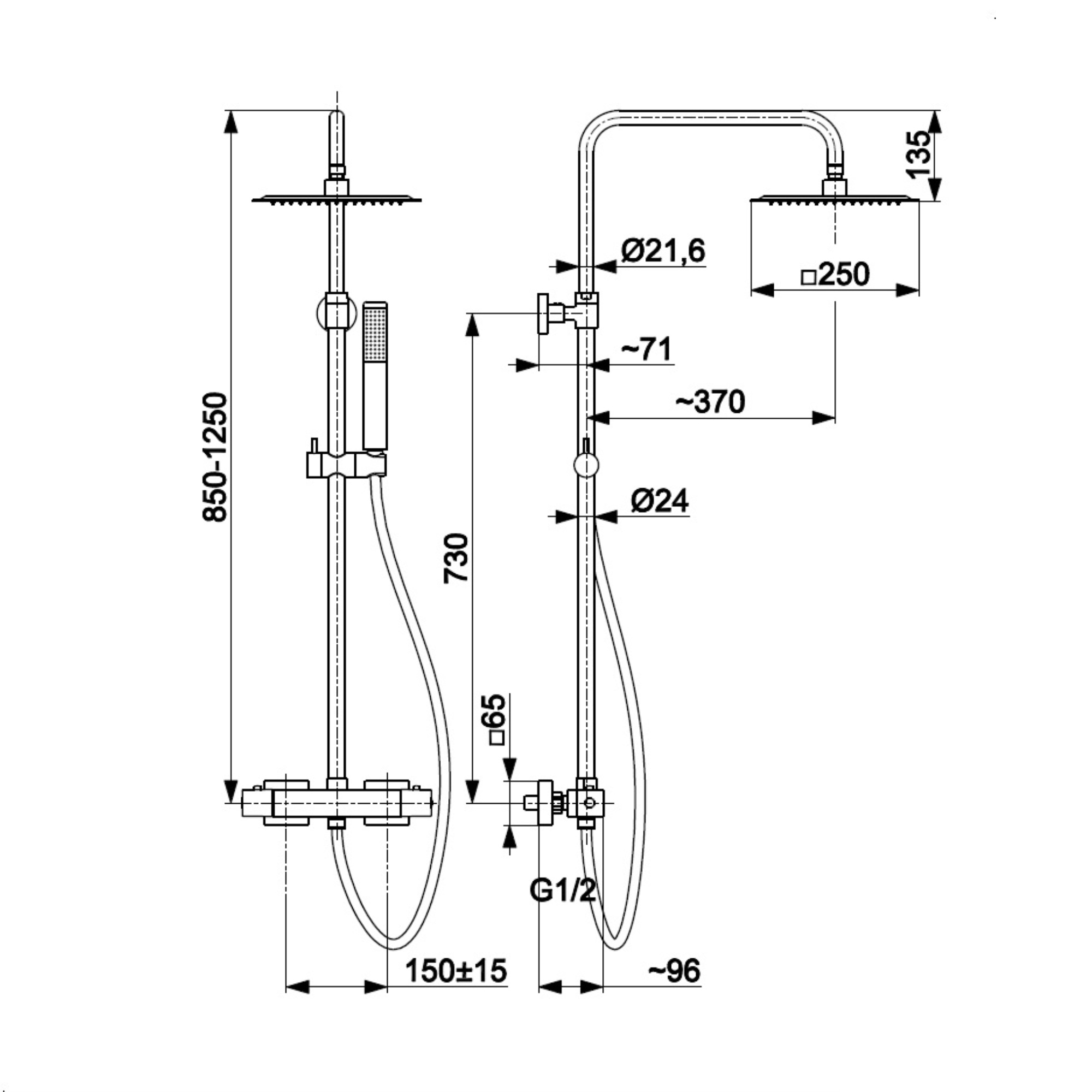 Dane techniczne: - rozstaw przyłączy: 150 ± 15 mm - średnica głowicy: 250x250 mm - długość węża: 1500 mm - przepływ wody: rączka natrysku 15 l/min - przepływ wody: deszczownica 17,8 l/min
