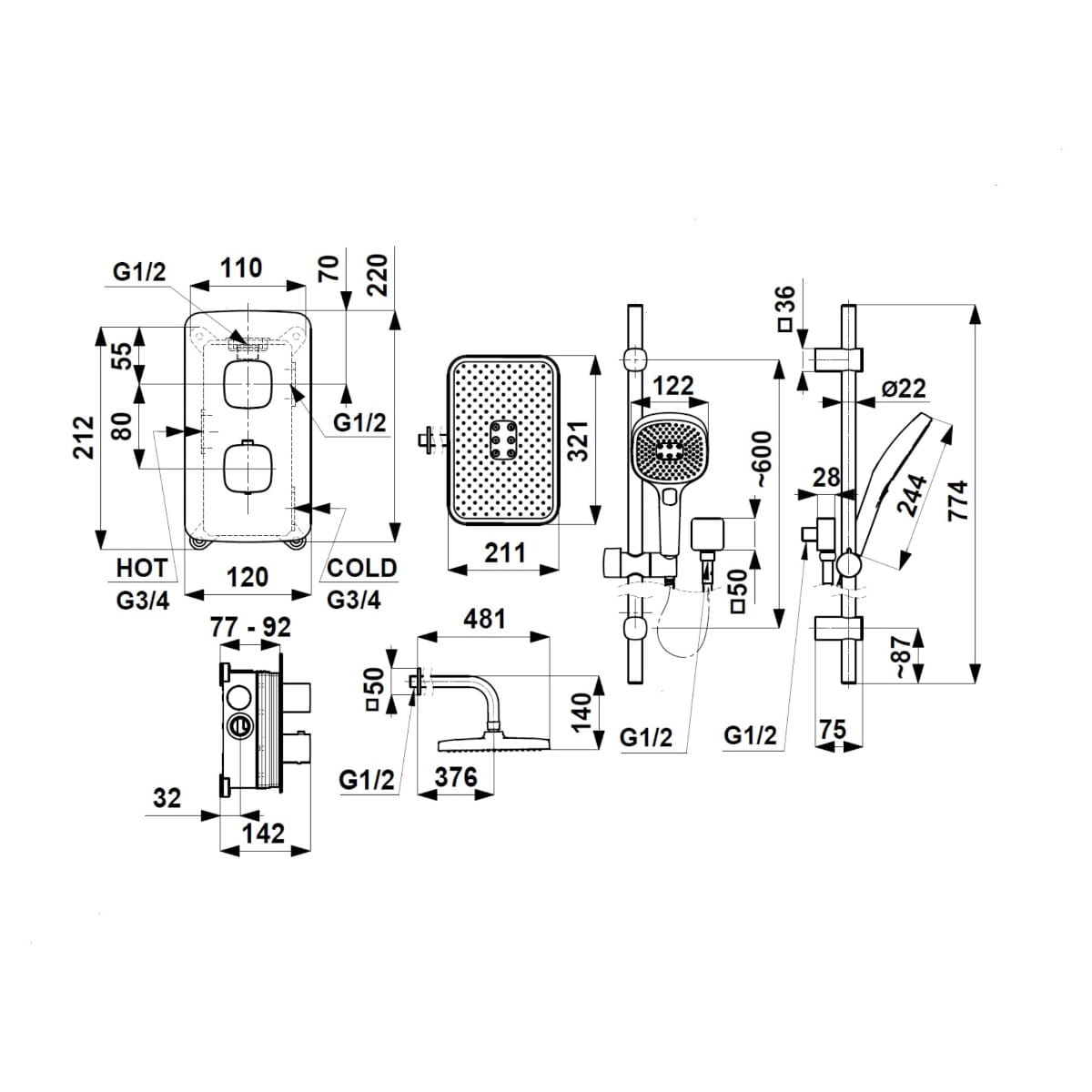 Dane techniczne: - wysokość drążka: 774 mm - wymiar rozety: 220x120 mm - zasięg wylewki deszczownicy: 376 mm - wymiary deszczownicy: 321x211 mm - długość węża: 1500 mm - przepływ wody [l/min]: dysk 17 / rączka 11 - ciśnienie robocze: 3 atm