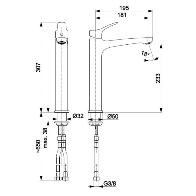 Dane techniczne: - przepływ wody: 8 l/min - wysokość baterii: 307 mm - zasięg wylewki: 181 mm