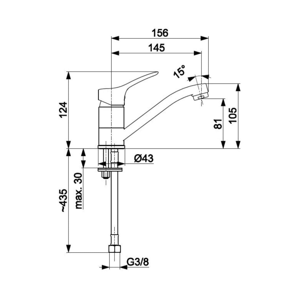 Dane techniczne: - zasięg wylewki: 145 mm - wysokość baterii: 124 mm - przepływ wody: 12,5