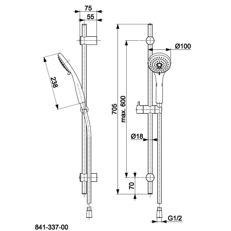 W komplecie znajduje się drążek natrysku, uchwyty ścienne - 2 szt. (w tym 1 uchwyt z możliwością dostosowania położenia do starych otworów), zestaw montażowy (2 wkręty z kołkami ściennymi), rączka natrysku z uchwytem oraz wąż PVC.