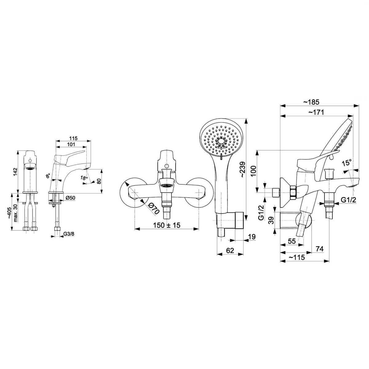 Dane techniczne baterii umywalkowej: - długość wylewki: 115 mm - wysokość baterii: 142 mm - przyłącze: G3/8
