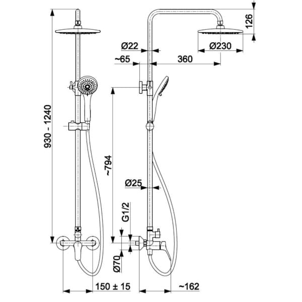 Dane techniczne: - długość drążka natrysku: 930- 1240 - średnica głowicy natrysku: 230 mm - długość ramienia natrysku: 360 mm - przepływ wody [l/min]: rączka natrysku 7,5/ dysk 11 - długość węża: 1500 mm