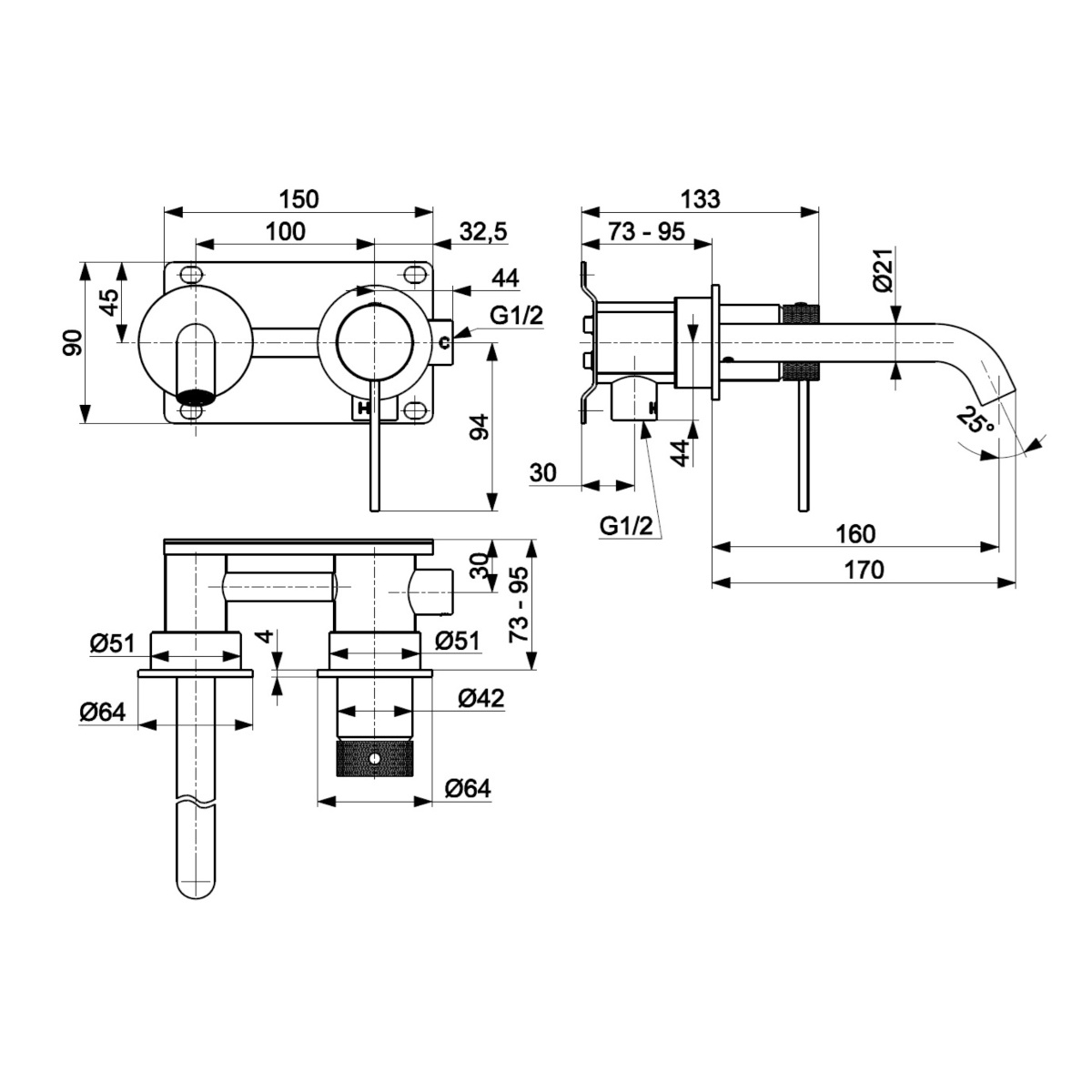 Dane techniczne: - średnica rozet: 64 mm - długość wylewki: 170 mm - zasięg wylewki: 160 mm - przepływ wody [l/min]: 5 - ciśnienie robocze [atm]: 3 - temperatura wody [°C] maks.: ≤90/65