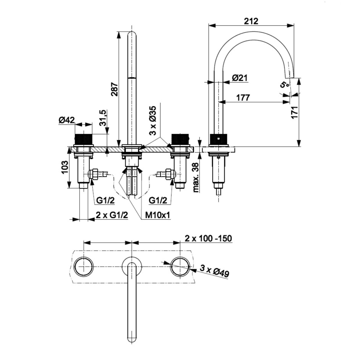 Dane techniczne: - wysokość: 287 mm - długość: 212 mm - zasięg wylewki: 177 mm - przepływ wody [l/min]:5 - ciśnienie robocze [atm]: 3 - temperatura wody [°C] maks.: ≤90/65