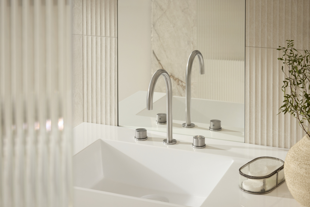 Kolekcja Moza 316L to uosobienie trendu dyskretnego luksusu. Jej naturalne, szczotkowane wykończenie w kolorze inox nie narzuca się, lecz subtelnie podkreśla klasę wnętrza. Unikalnym detalem są radełkowane elementy uchwytów, które nie tylko ułatwiają obsługę mokrymi dłońmi, ale też przepięknie odbijają światło, nadając produktom niemal jubilerski charakter.