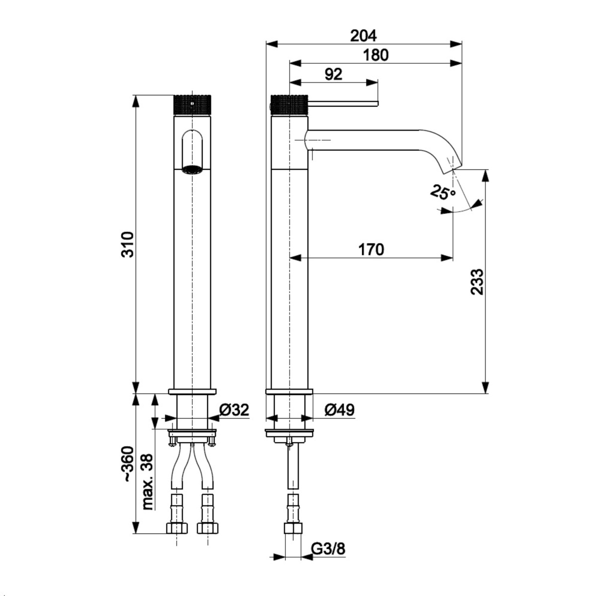 Dane techniczne: - wysokość: 310 mm - długość: 204 mm - zasięg wylewki: 170 mm - przepływ wody [l/min]: 5 - ciśnienie robocze [atm]: 3 - temperatura wody [°C] maks.:≤90/65