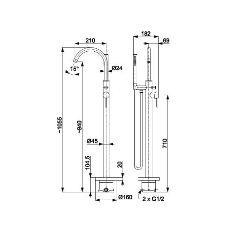 Dane techniczne: - zasięg wylewki: 210 mm - wysokość baterii: 1055 mm - długość węża: 1500 mm - przyłącze: G1/2 - regulator ceramiczny: 35 mm