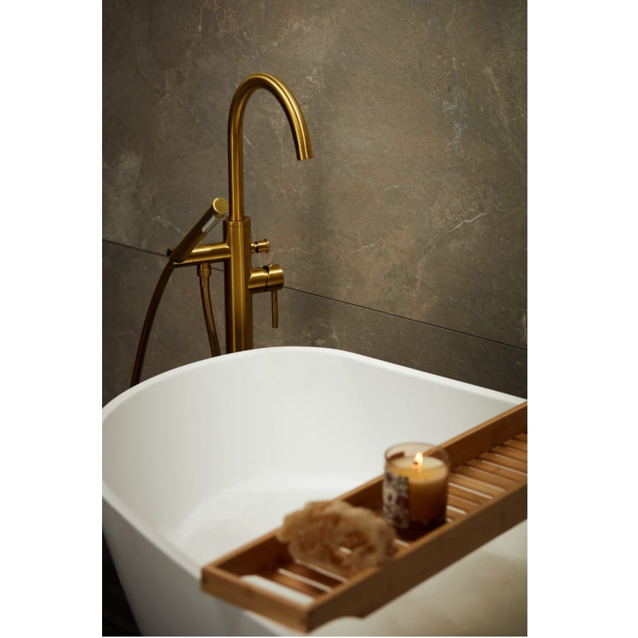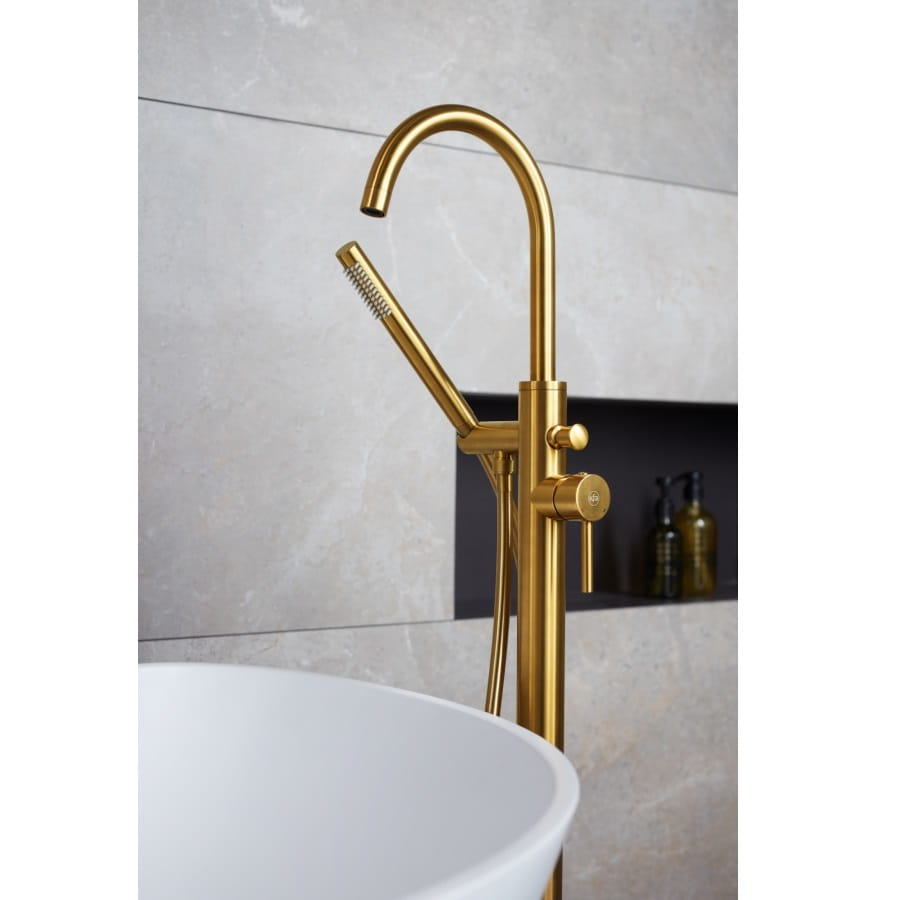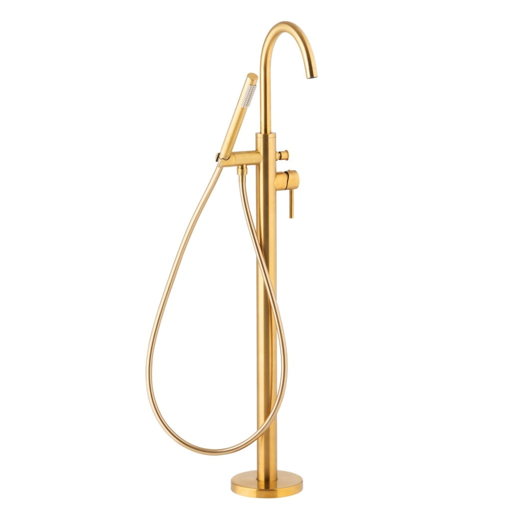 Główne cechy: - kolor: złota szczotkowana - rodzaj: wannowo-natryskowa - typ: jednouchwytowa - montaż: wolnostojąca - rodzaj wylewki: obrotowa - materiał węża: PVC - perlator - box montażowy z funkcją płukania instalacji, wężyk do płukania jest częścią zestawu - box jest wyposażony w mikropoziomicę, ułatwiającą montaż