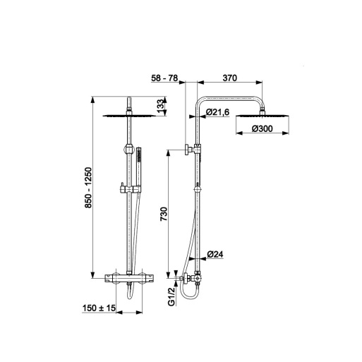 Dane techniczne: - długość drążka natrysku: 850-1250 - średnica głowicy natrysku: 300 mm - długość ramienia natrysku: 370 mm - rozstaw przyłączy:150 ± 15 mm - długość węża: 1500 mm - przepływ wody [l/min]: 18