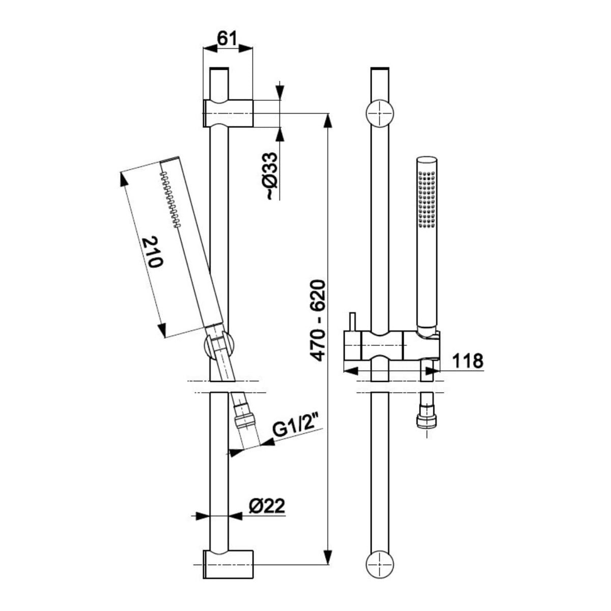 Dane techniczne: - długość rączki: 210 mm - średnica drążka: 22 mm - długość węża: 1500 mm - przepływ wody: 22 l/min