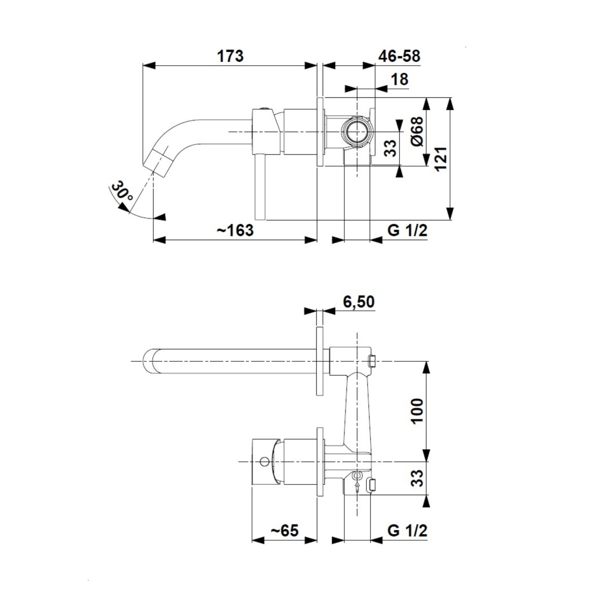 Dane techniczne: - długość: 173 mm - zasięg wylewki: 163 mm - Przepływ wody [l/min]: 6 - Ciśnienie robocze [atm]: 3 - Temperatura wody [°C] maks.: ≤90/65