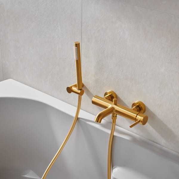 Główne cechy: - kolor: złoty szczotkowany - rodzaj: wannowo-natryskowa - typ: jednouchwytowa - montaż: naścienna - rodzaj wylewki: stała - przełącznik: wanna / natrysk