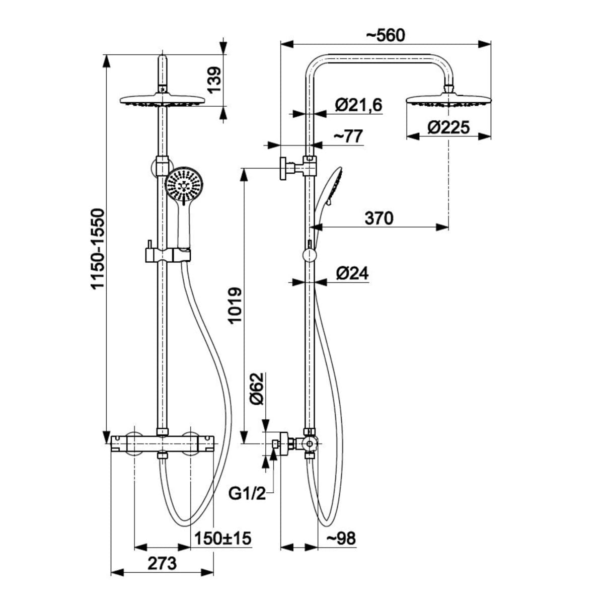 Dane techniczne: - długość drążka natrysku: 1150 - 1550 - średnica głowicy natrysku: 225 mm - długość ramienia natrysku: 370 mm - szerokość baterii: 273 mm - rozstaw przyłączy:150 ± 15 mm - długość węża: 1500 mm