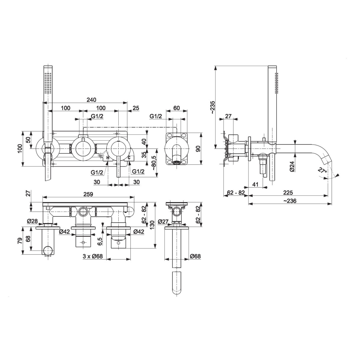 Dane techniczne: - zasięg wylewki: 225 mm - długość węża [mm]: 1500 - ilość strumieni rączki natrysku: 1 - przepływ wody [l/min]: rączka natrysku 11,5 / wylot 23 - ciśnienie robocze [atm]: 3 - temperatura wody [°C] maks.: ≤90/65