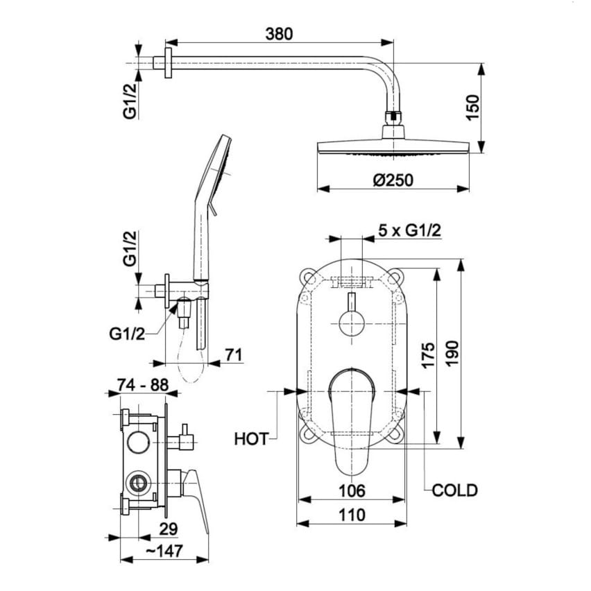 Dane techniczne: - długość węża: 1500 mm - ramię natrysku: 3860 mm - średnica talerza: 250 mm - średnica przyłącza 1/2"