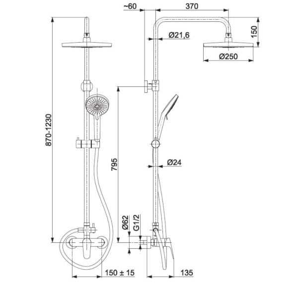 Dane techniczne: - długość drążka natrysku: 870- 1230 - średnica głowicy natrysku: 250 mm - długość ramienia natrysku: 370 mm - przepływ wody [l/min]: rączka natrysku 10 / dysk 9 - długość węża: 1500 mm