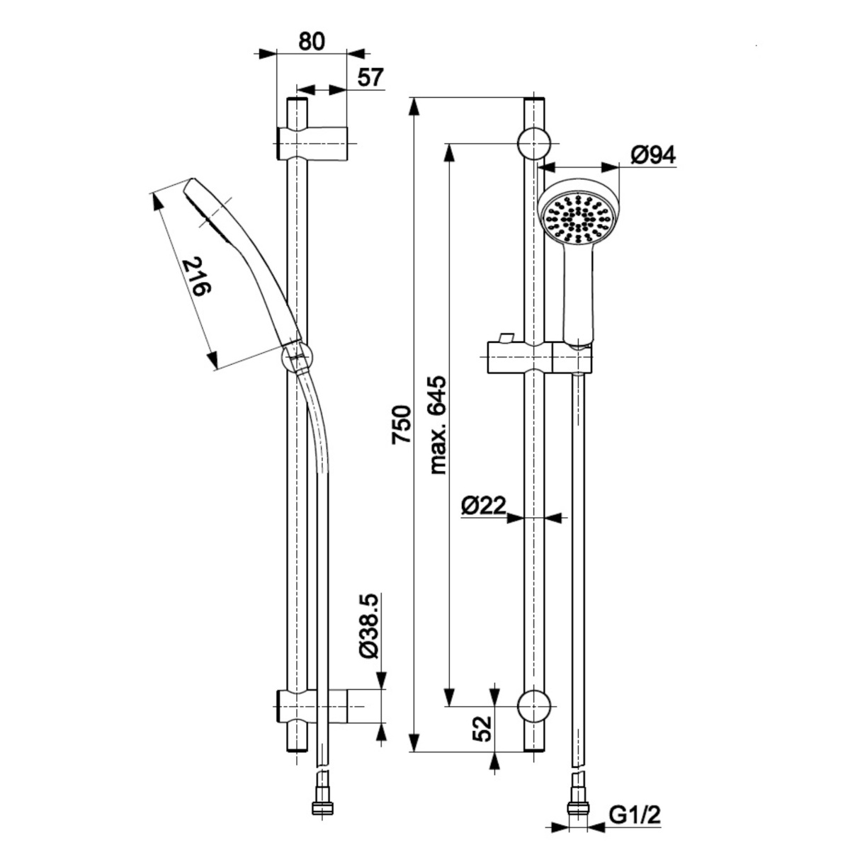 Dane techniczne: - długość węża: 1500 mm - przepływ wody[l/min]: 12 l - długość rączki: 216 mm - średnica głowicy: 94 mm - wysokość drążka: 750 mm
