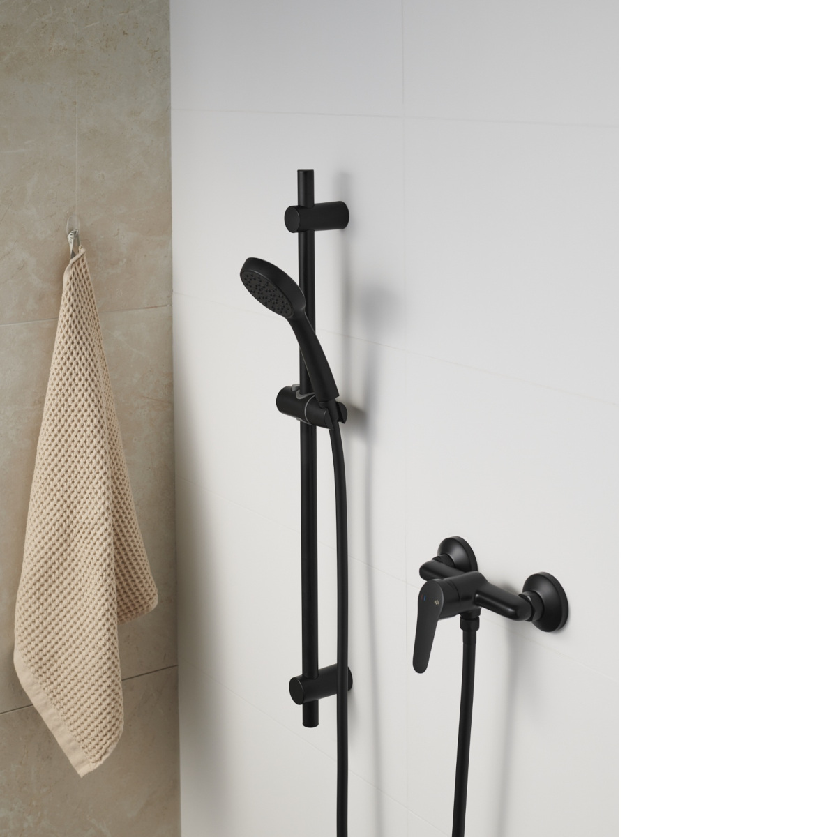 Główne cechy: - kolor: czarny - montaż: naścienny - materiał: stal nierdzewna+ tworzywo ABS - materiał węża: PVC - ilość strumieni wody: 1