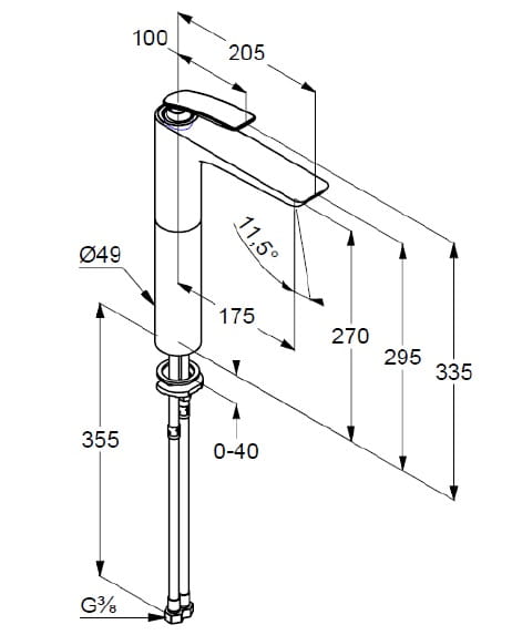 Dane techniczne: - wysokość korpusu: 270 mm - elastyczne wężyki ciśnieniowe G 3/8 - przepływ wody 8 l/min przy ciśnieniu 3 bar