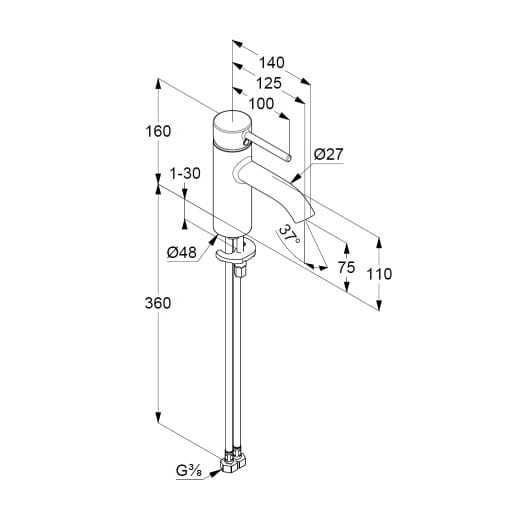 Dane techniczne: - perlator s-pointer Caché M 18,5 x 1 - elastyczne wężyki ciśnieniowe G 3/8 - zasięg wylewki: 125 mm - przepływ wody 5 l/min przy ciśnieniu 3 bar