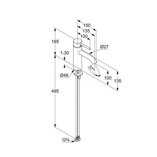Dane techniczne: - przepływ wody 3,8 l/min przy ciśnieniu 3 bar - wysokość do wylewki: 100 mm - zasięg wylewki: 135 mm - wysokość całkowita: 185 mm - elastyczne wężyki ciśnieniowe 3/8 - perlator s-pointer Caché M 18,5 x 1