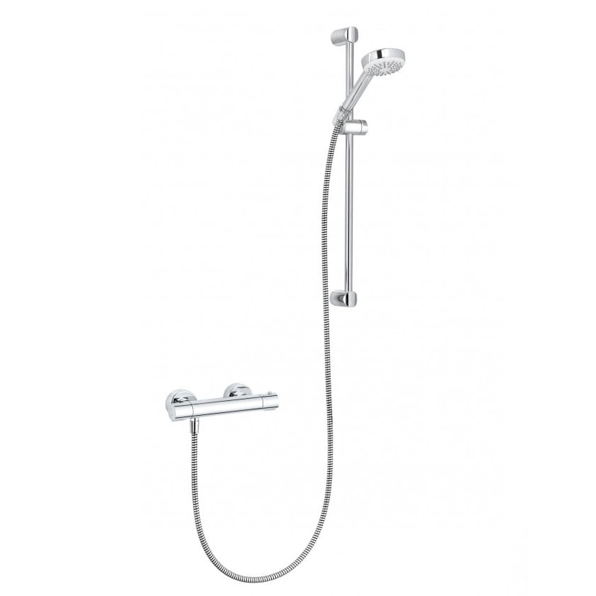 Główne cechy: - kolor: chrom - montaż: naścienny - uchwyt regulacji temperatury z blokadą przy 38°C - zawór odcinający - sitko wychwytujące zanieczyszczenia - zawór zwrotny - rączka natrysku KLUDI LOGO 1S 68 100 05-00 - osłona z tworzywa sztucznego z efektem metalicznym
