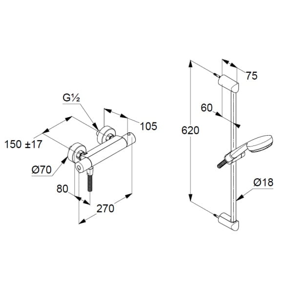 W komplecie znajduje się bateria termostatyczna, drążek prysznicowy, słuchawka oraz wąż prysznicowy.