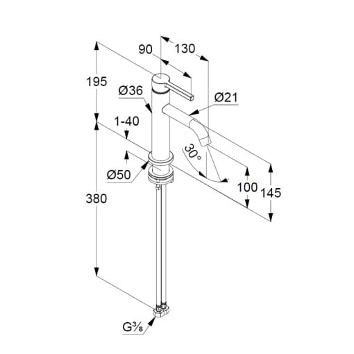 Dane techniczne: - zasięg wylewki: 130 mm - przepływ wody 4,5 l/min przy ciśnieniu 3 bar - perlator s-pointer Caché M 18,5 x 1 - wysokość baterii: 195 mm