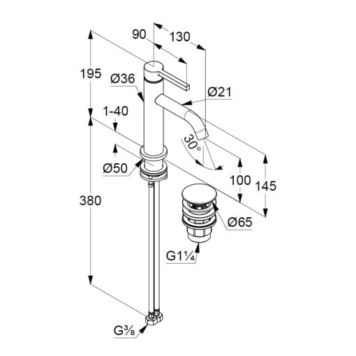 Dane techniczne: - zasięg wylewki: 130 mm - przepływ wody 4,5 l/min przy ciśnieniu 3 bar - perlator s-pointer Caché M 18,5 x 1 - wysokość baterii: 195 mm