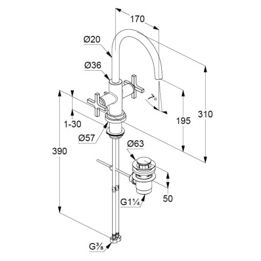 Dane techniczne: - zestaw odpływowy 1 1/4" - perlator laminarny Eco PCA M 18,5 x 1 - obrotowa wylewka z opcją blokady (150° / 360°) - zestaw odpływowy G 1 1/4 wykonany z metalu - elastyczne wężyki ciśnieniowe G 3/8 - zasięg wylewki: 170 mm