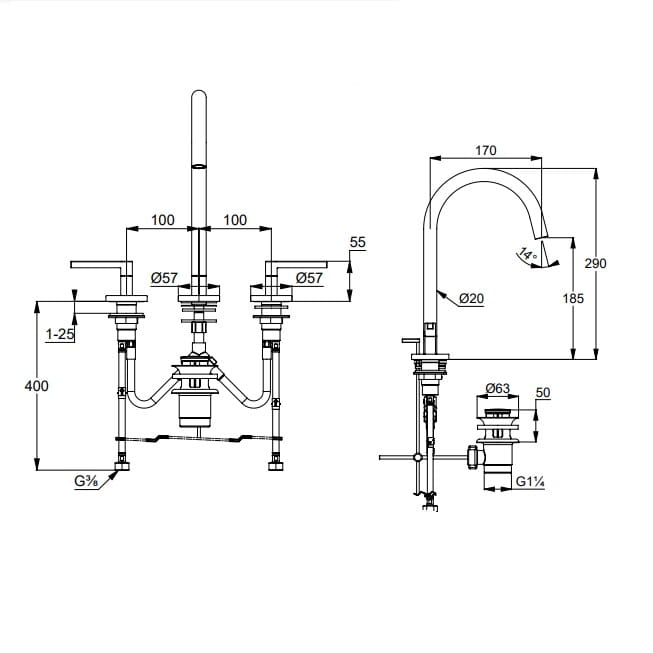 Dane techniczne: - wysokość korpusu: 290 mm - zasięg wylewki: 170 mm - średnica przyłącza węża: 3/8"