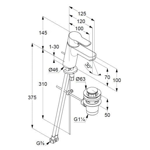 Dane techniczne: - zestaw odpływowy 1 1/4" - perlator M 24 x 1 - przepływ wody 7 l/min przy ciśnieniu 3 bar - elastyczne wężyki ciśnieniowe G 3/8 - zasięg wylewki: 120 mm