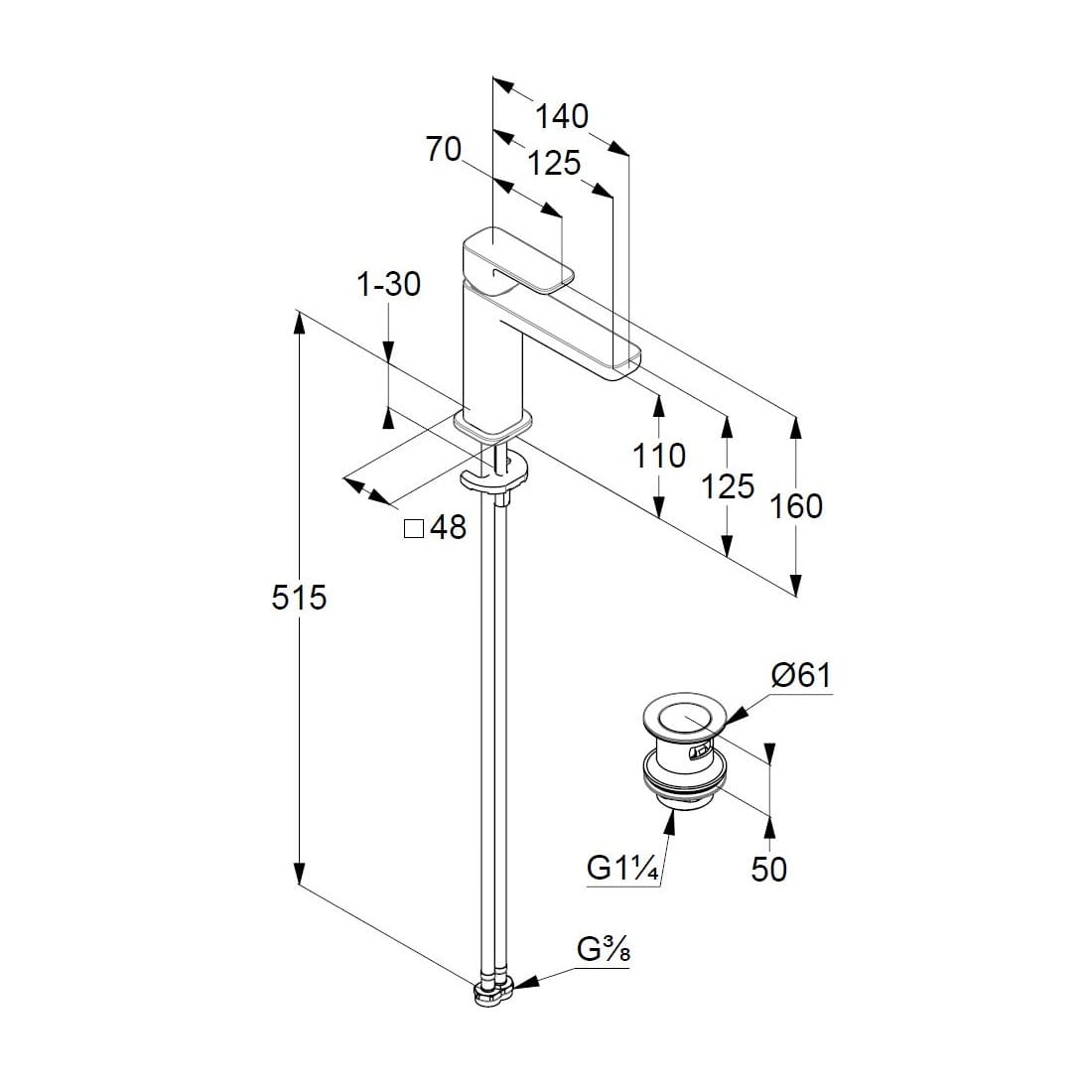 Dane techniczne: - zasięg wylewki: 125 mm - wysokość baterii: 160 mm - wysokość do perlatora: 110 mm - przepływ wody 5 l/min przy ciśnieniu 3 bar - perlator s-pointer Caché M 18,5 x 1