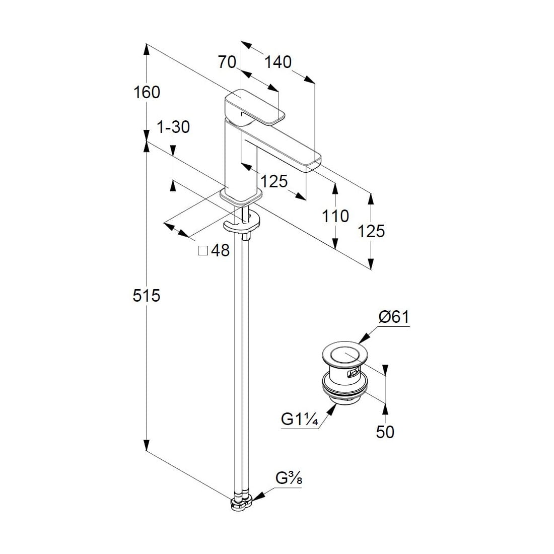 Dane techniczne: - zasięg wylewki: 125 mm - wysokość baterii: 160 mm - wysokość do perlatora: 110 mm - przepływ wody 5 l/min przy ciśnieniu 3 bar - perlator s-pointer Caché M 18,5 x 1