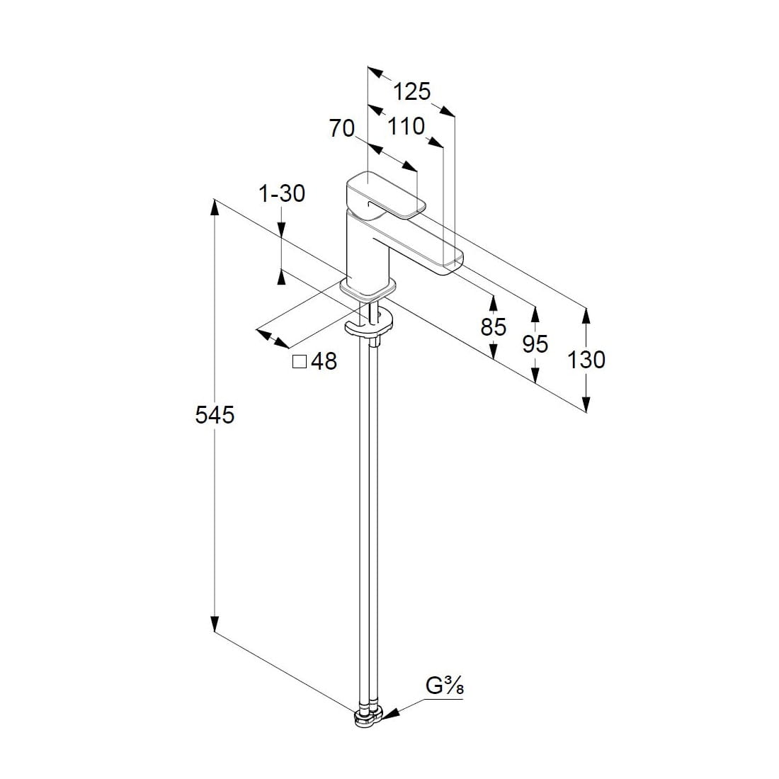 Dane techniczne: - zasięg wylewki: 110 mm - wysokość baterii: 130 mm - wysokość do perlatora: 85 mm - przepływ wody 5 l/min przy ciśnieniu 3 bar - perlator s-pointer Caché M 18,5 x 1