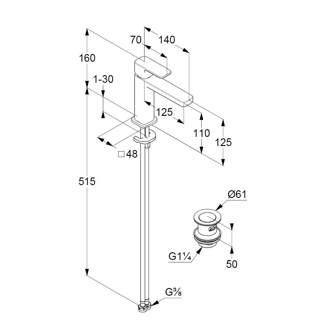 Dane techniczne: - zasięg wylewki: 125 mm - wysokość baterii: 160 mm - wysokość do perlatora: 110 mm - przepływ wody 5 l/min przy ciśnieniu 3 bar - perlator s-pointer Caché M 18,5 x 1