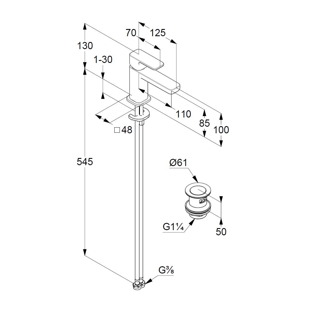 Dane techniczne: - zasięg wylewki: 110 mm - wysokość baterii: 130 mm - wysokość do perlatora: 85 mm - przepływ wody 5 l/min przy ciśnieniu 3 bar - perlator s-pointer Caché M 18,5 x 1