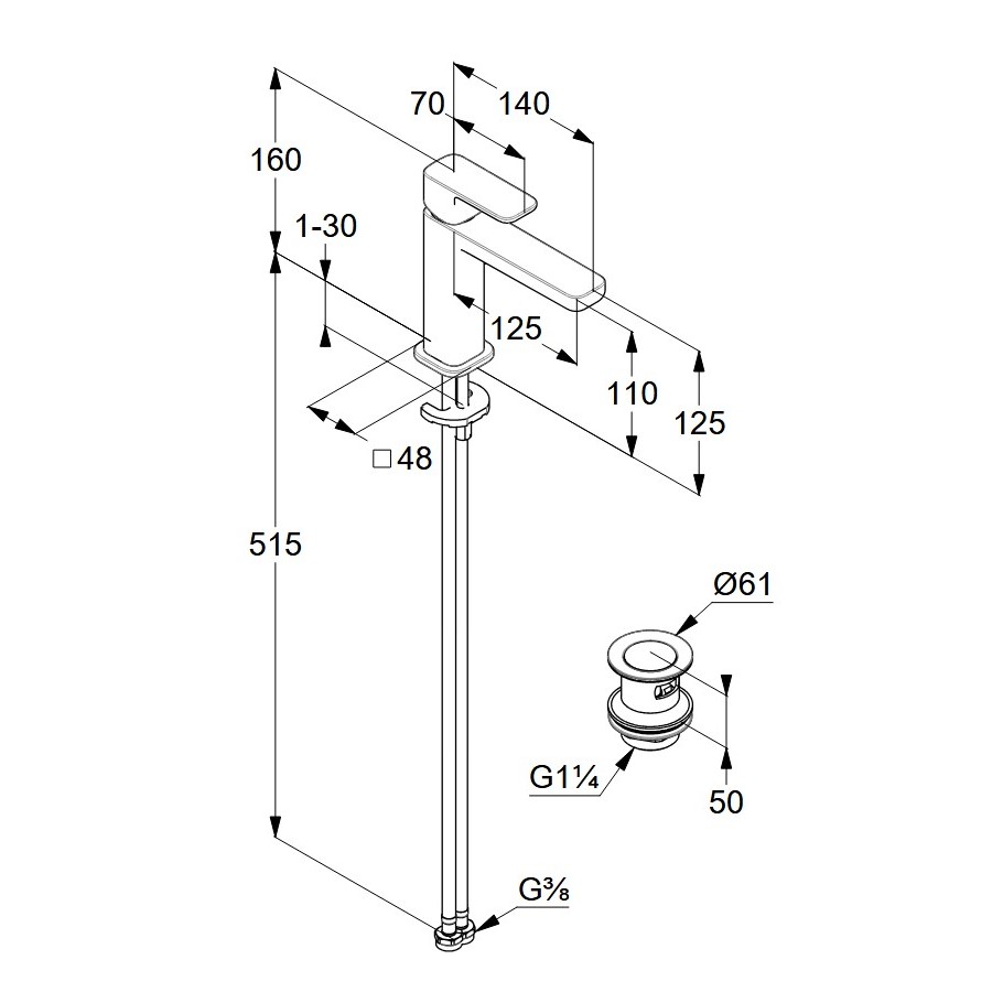 Dane techniczne: - zasięg wylewki: 125 mm - wysokość baterii: 160 mm - wysokość do perlatora: 110 mm - przepływ wody 5 l/min przy ciśnieniu 3 bar - perlator s-pointer Caché M 18,5 x 1