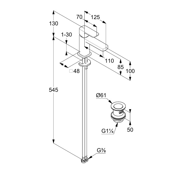 Dane techniczne: - zasięg wylewki: 125 mm - wysokość baterii: 130 mm - wysokość do perlatora: 85 mm - przepływ wody 5 l/min przy ciśnieniu 3 bar - perlator s-pointer Caché M 18,5 x 1