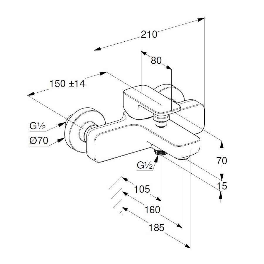 Dane techniczne: - przyłącze: G1/2 - długość baterii: 185 mm - szerokośc baterii: 210 mm - rozstaw przyłączy: 150 mm - wanna: przepływ wody 20 l/min przy ciśnieniu 3 bar - natrysk: przepływ wody 18 l/min przy ciśnieniu 3 bar