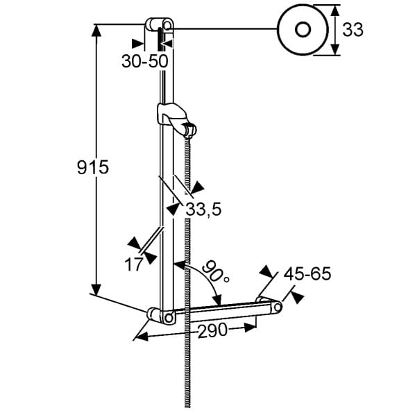 Dane techniczne: - odporny na skręcanie Suparaflex-wąż natryskowy G 1/2 x G 1/2 x 1600 mm - uchwyty pomocnicze (długość uchwytu 250 mm i kąt 90°) - wysokość: 915 mm - 50 mm odstęp od ściany