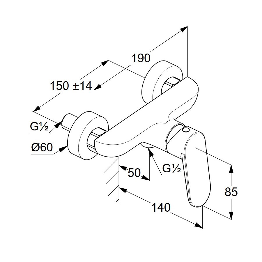 Dane techniczne: - szerokość 190 mm - długość: 140 mm - rozstaw przyłączy: 150 mm - przyłącza mimośrodowe G 1/2 - przepływ wody 23 l/min przy ciśnieniu 3 bar