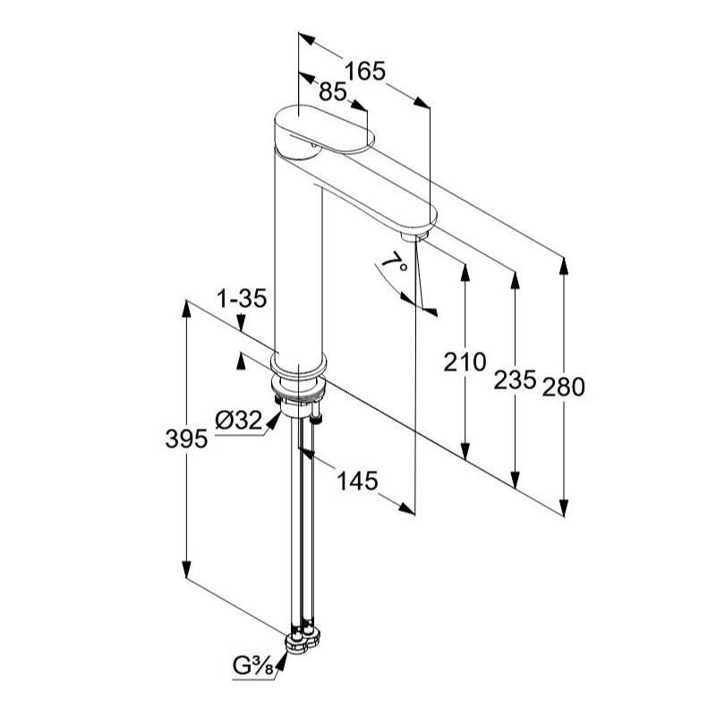 Dane techniczne: - wysokość: 280 mm - zasięg wylewki: 165 mm - przepływ wody przy ciśnieniu 3 bar: 5 l/min