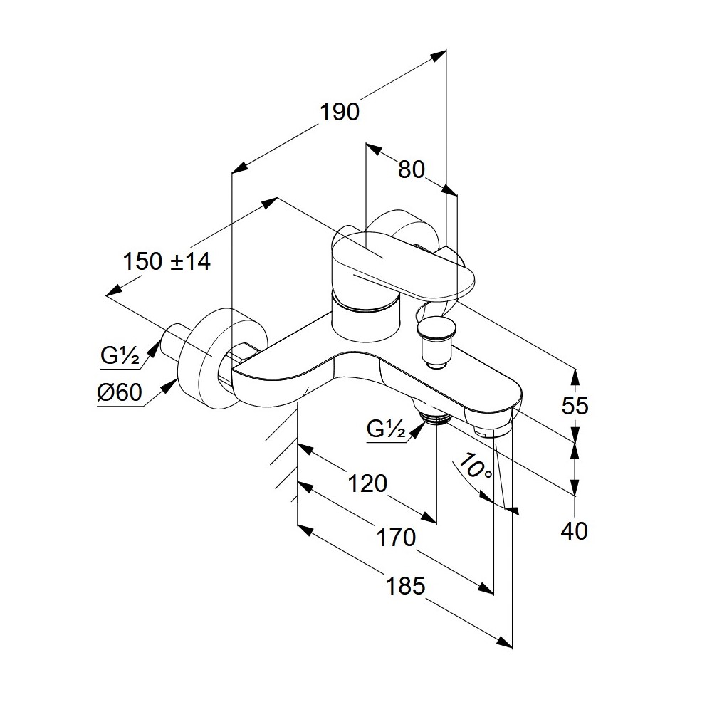 Dane techniczne: - szerokość: 290 mm - długość: 185 mm - zasięg wylewki: 170 mm - rozstaw przyłączy: 150 - wanna: przepływ wody przy ciśnieniu 3 bar: 20 l/min - natrysk: przepływ wody przy ciśnieniu 3 bar: 18 l/min